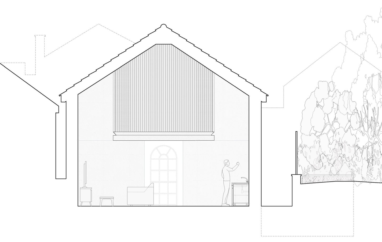 The approach balances respect for the chapel’s historic character with carefully considered contemporary interventions. The front façade will be restored to its original symmetrical gable form, reinstating the rhythm and proportion typical of early 19th-century chapels. At the rear, where steep level changes have long limited access and connection to the garden, a new sunken terrace is introduced. This feature allows the main living spaces to open directly onto the courtyard through tall glazed doors, improving natural light and creating a seamless relationship between the interior and the landscape beyond.